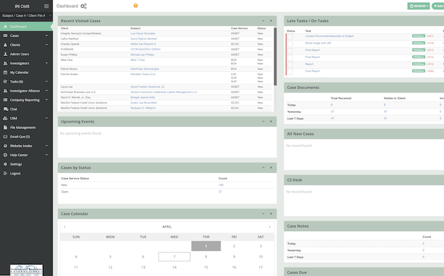 Investigative Resources International maintains a secure (SOC 2 TYPE II Certified) and convenient Case Management System (CMS) to manage assigned casework confidentially. This system provides a private message center as well as other features useful to exchange case details, background information, reference materials and reports.